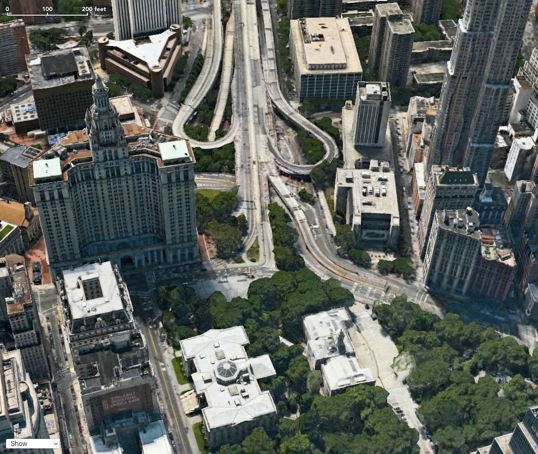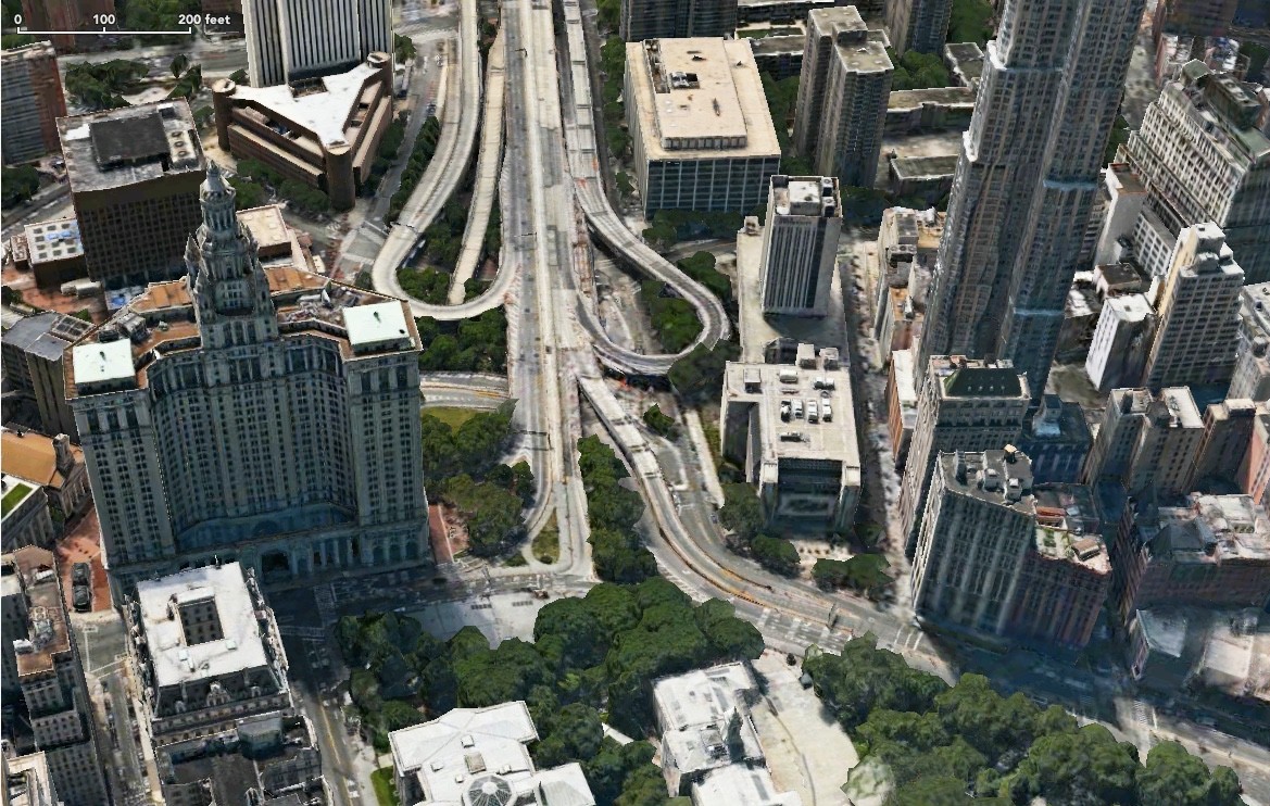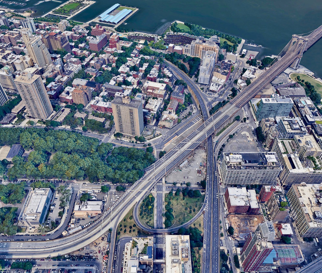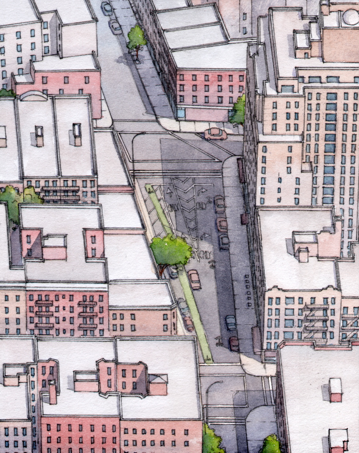 - BEFORE: Jane Jacobs Square, New York, New York. An aerial view looking south. © Massengale & Co LLC and Dover, Kohl & Partners, Rendering by James Dougherty.