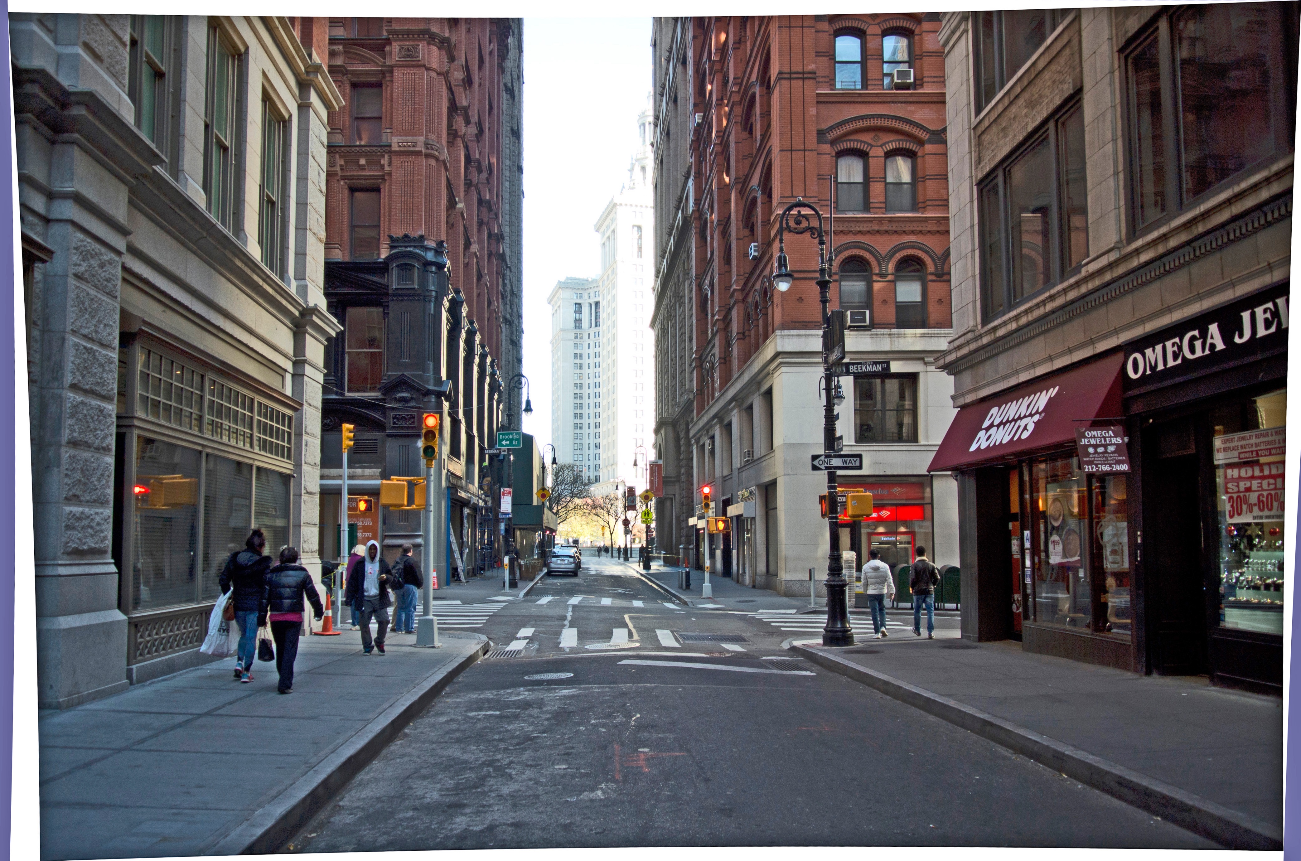 - BEFORE: Nassau Street, looking towards Beekman Street and the the Municipal Building.
