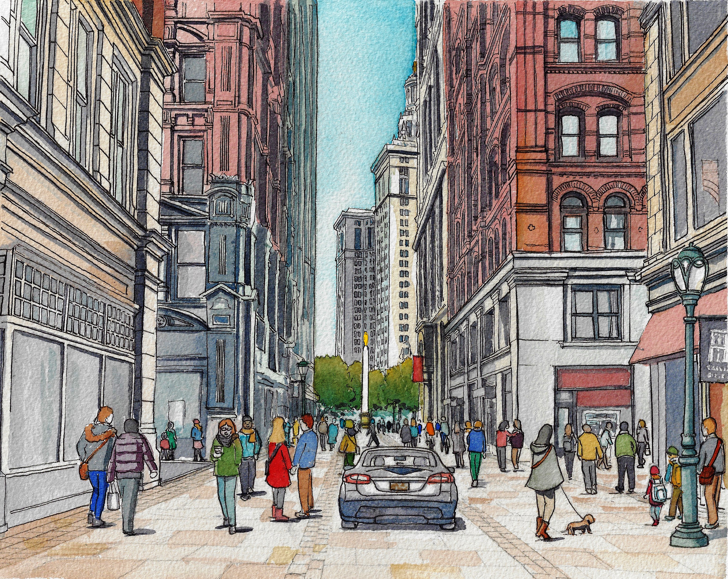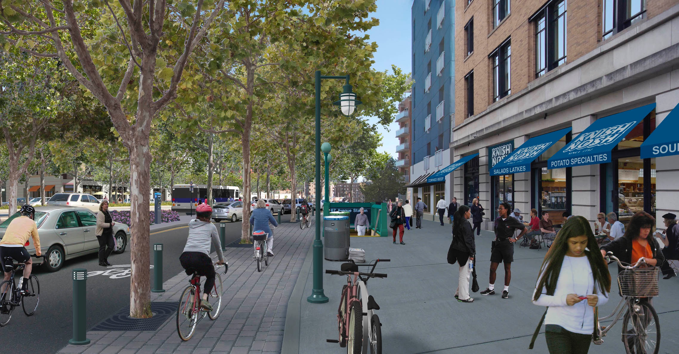 - AFTER: Beekman Street redesigned as a Slow Street. © 2017 Massengale & Co LLC, Rendering by Gabriele Stroik Johnson.