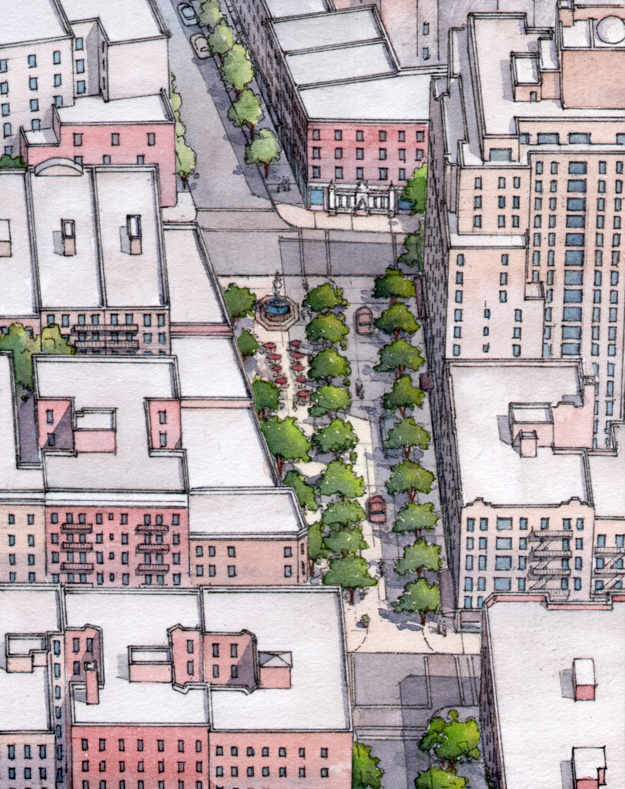 - AFTER: Jane Jacobs Square, New York, New York. An aerial view looking south. © Massengale & Co LLC and Dover, Kohl & Partners, Rendering by James Dougherty.